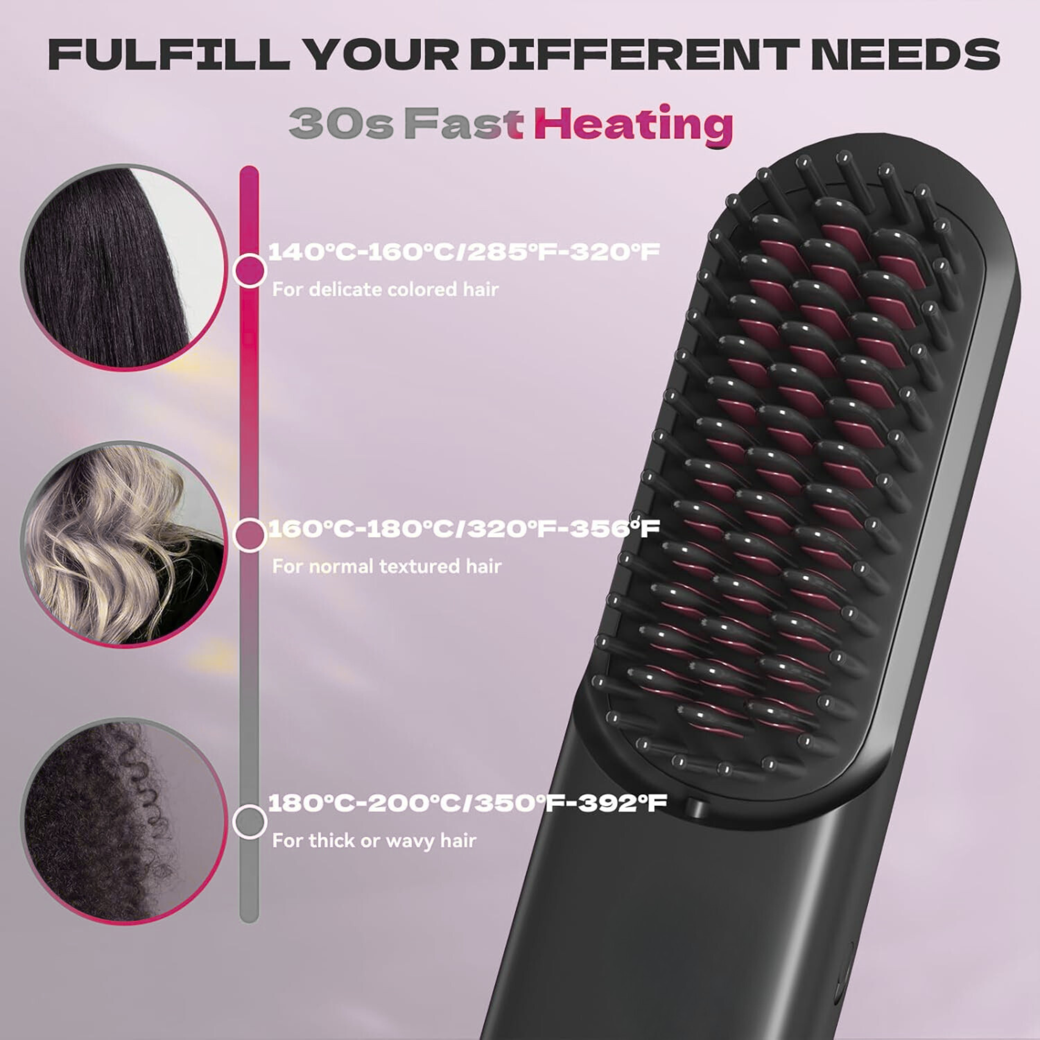 Customize the temperature on your cordless hair straightening brush to suit fine, thick, curly, or color-treated hair. -
