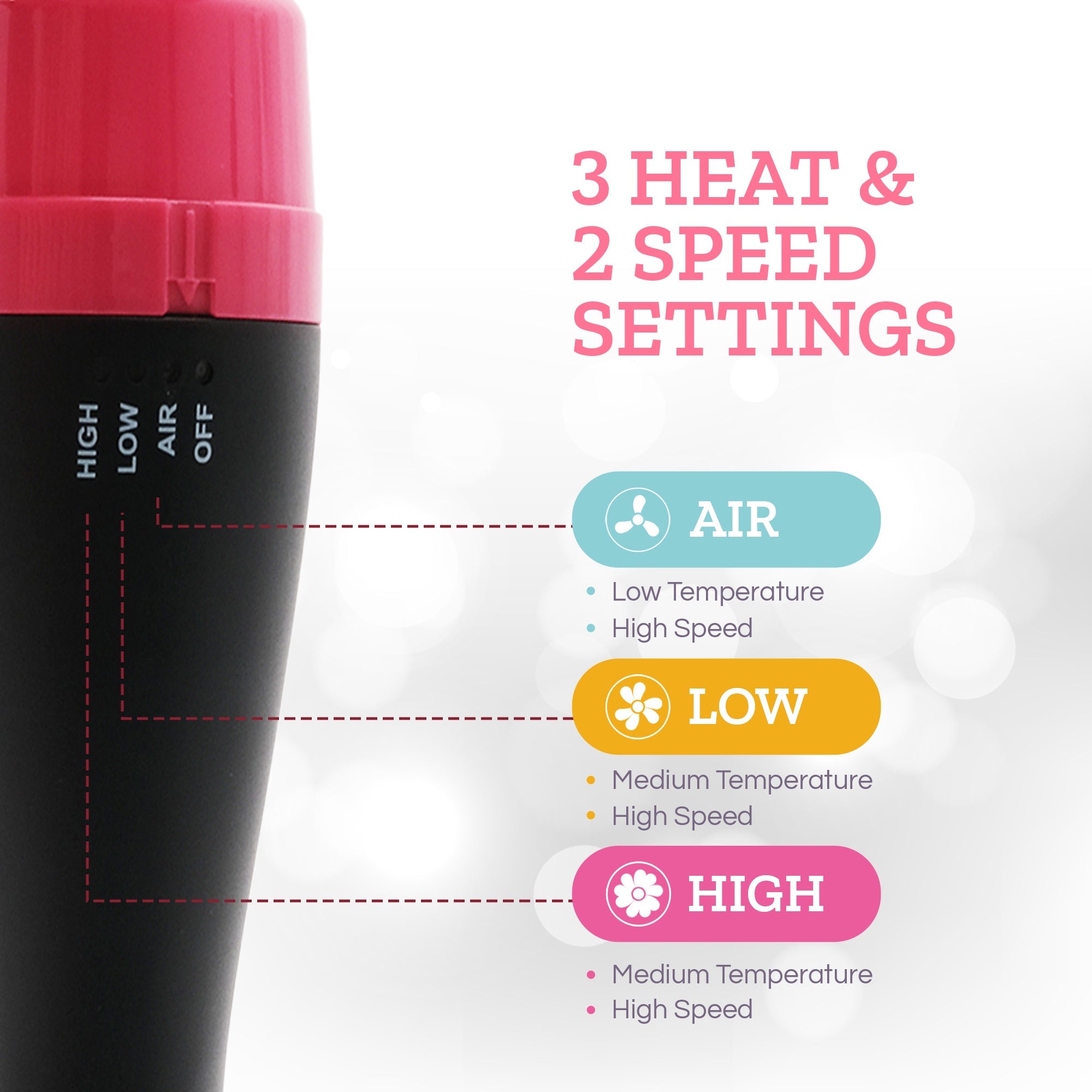 From sleek straight styles to big, bouncy volume – the red and black hair dryer brush gives you complete control with three adjustable heat settings.